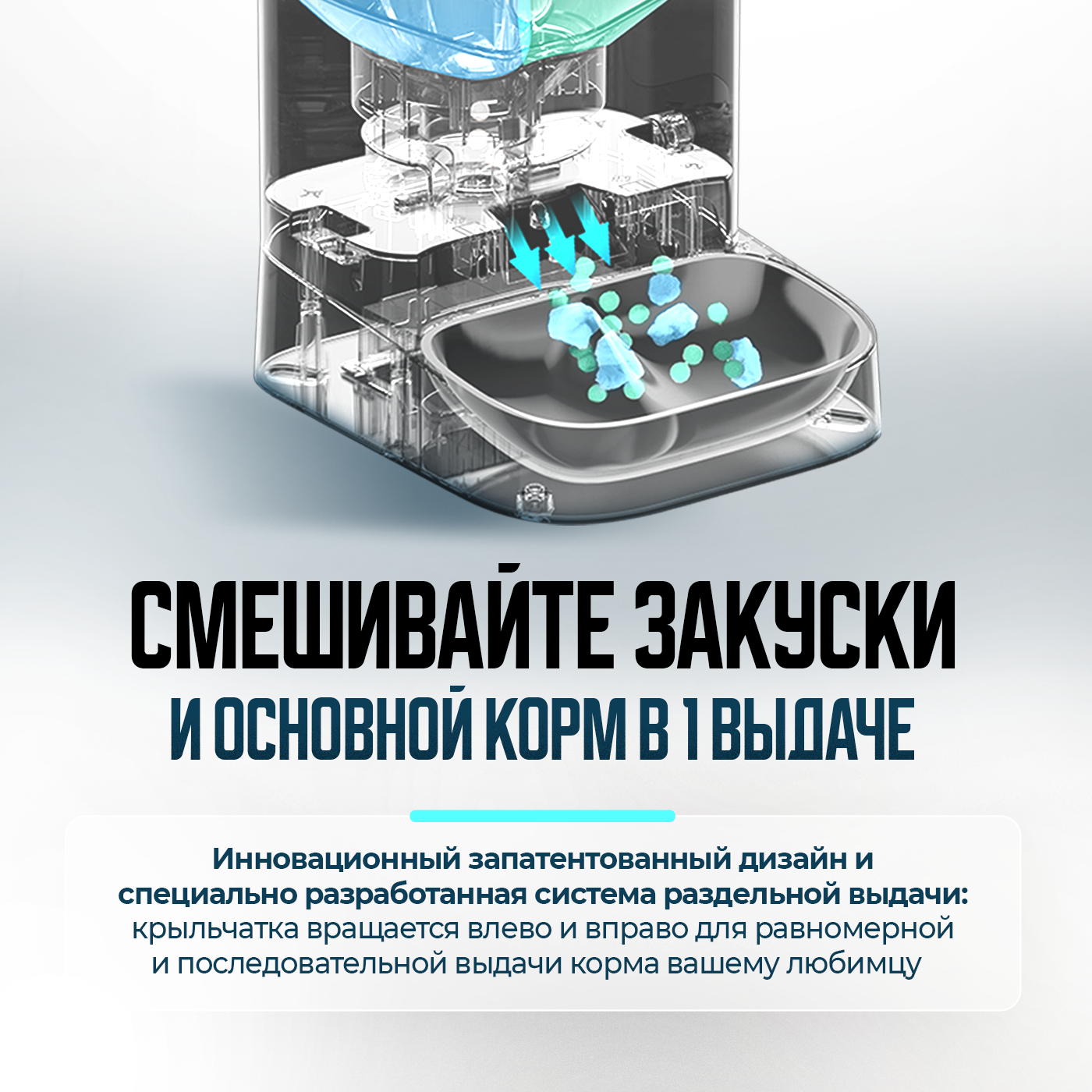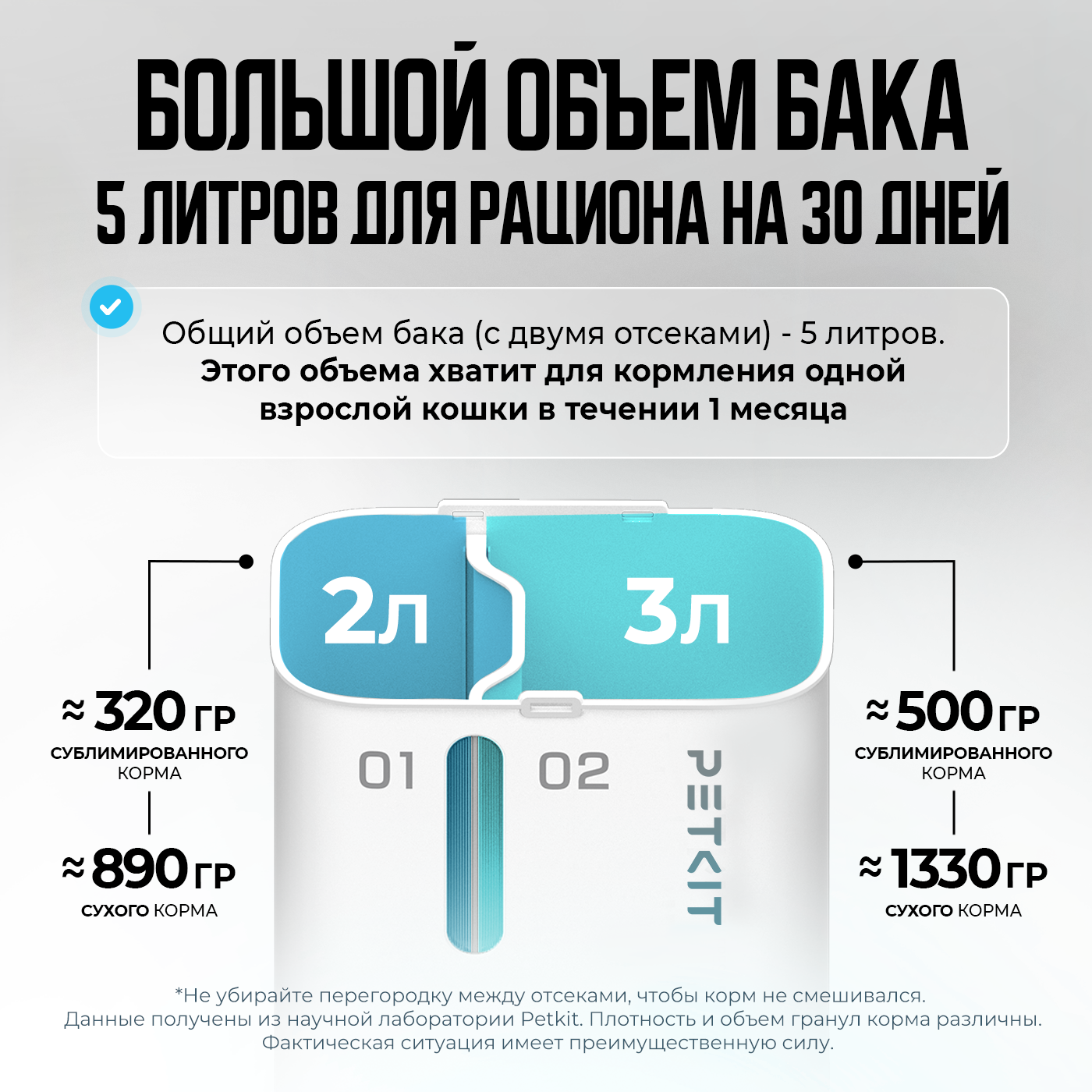- Маленький отсек — для сублимированного корма, большой отсек — для основного корма