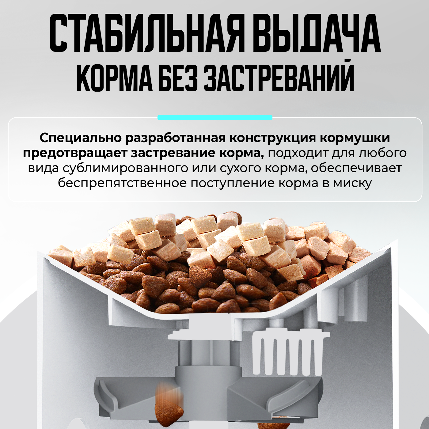 Специально разработанная конструкция кормушки предотвращает застревание корма, подходит для любого вида сублимированного и сухого корма, обеспечивает беспрепятственное поступление корма в миску.