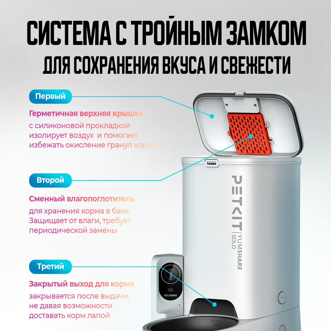 Закрываемое отверстие для подачи кормаАвтоматически закрывается после каждой подачи корма, тем самым сохраняя его вкусовые качества и свежесть.