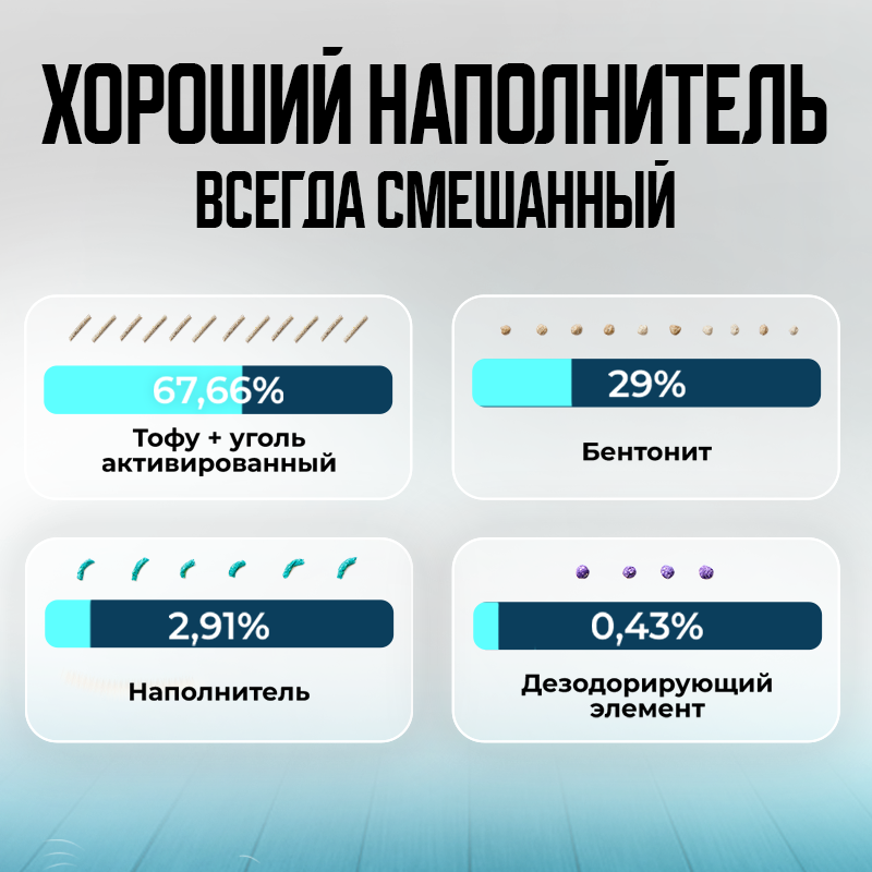 Наполнитель для кошачьего туалета PETKIT представляет собой комкующийся продукт на основе натуральных ингредиентов. Состав включает волокна гороха, кукурузный крахмал, кукурузную муку, бентонит, активированный уголь из кокосовой скорлупы и растительные компоненты бирюзового цвета. Процентное соотношение: тофу с активированным углем — 67%, бентонит — 29%, наполнитель — 2,9%, дезодорирующий элемент — 0,4%. Включает 42% окары из пищевого сырья, с естественным бобовым ароматом, без примесей и вредных добавок.