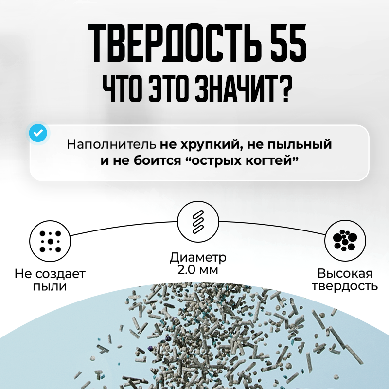 Твердость наполнителя - 55°, что делает его устойчивым к повреждениям от когтей, не хрупким и не пыльным, снижая риск для органов дыхания питомца. Гранулы приятны на ощупь для лап. Содержит бактериостатическое средство минимизируя сырость и плесень, обеспечивая сухость лотка. Легко убирается лопаткой.